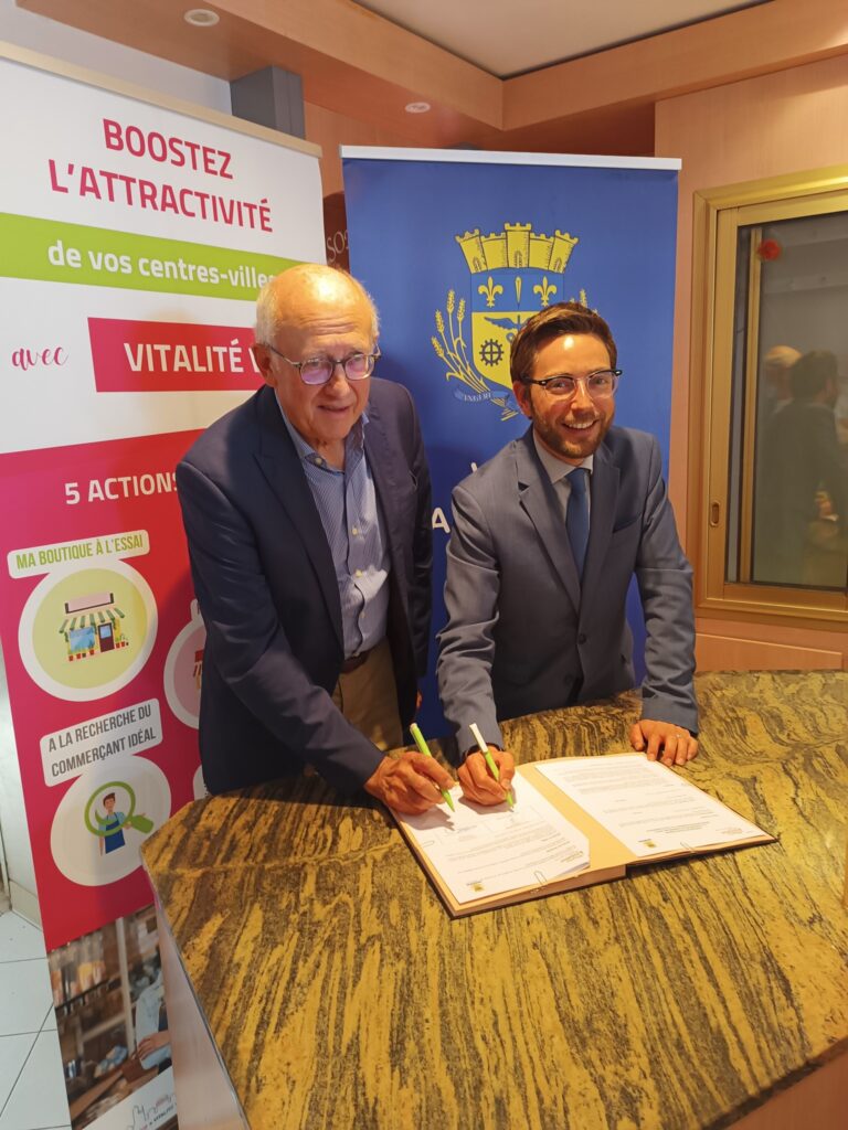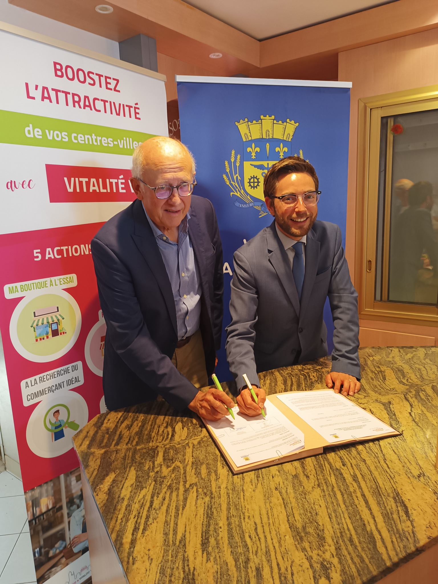 Ce matin (vendredi 13 juin), un moment clé pour le développement commercial d’Angerville a eu lieu au 13 rue nationale, dans l’ancienne charcuterie artisanale de la famille Pavard. C’est ici, que la convention pour le lancement du dispositif Vitalité Villes, avec l’action « À la recherche du commerçant idéal » a été signée par le Maire, Johann Mittelhausser, et Initiative Essonne, représentée par son nouveau Président, Michel Roussel.