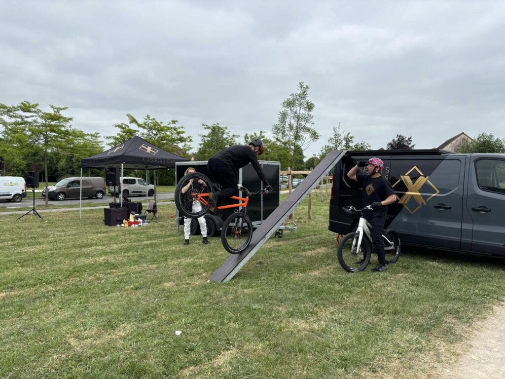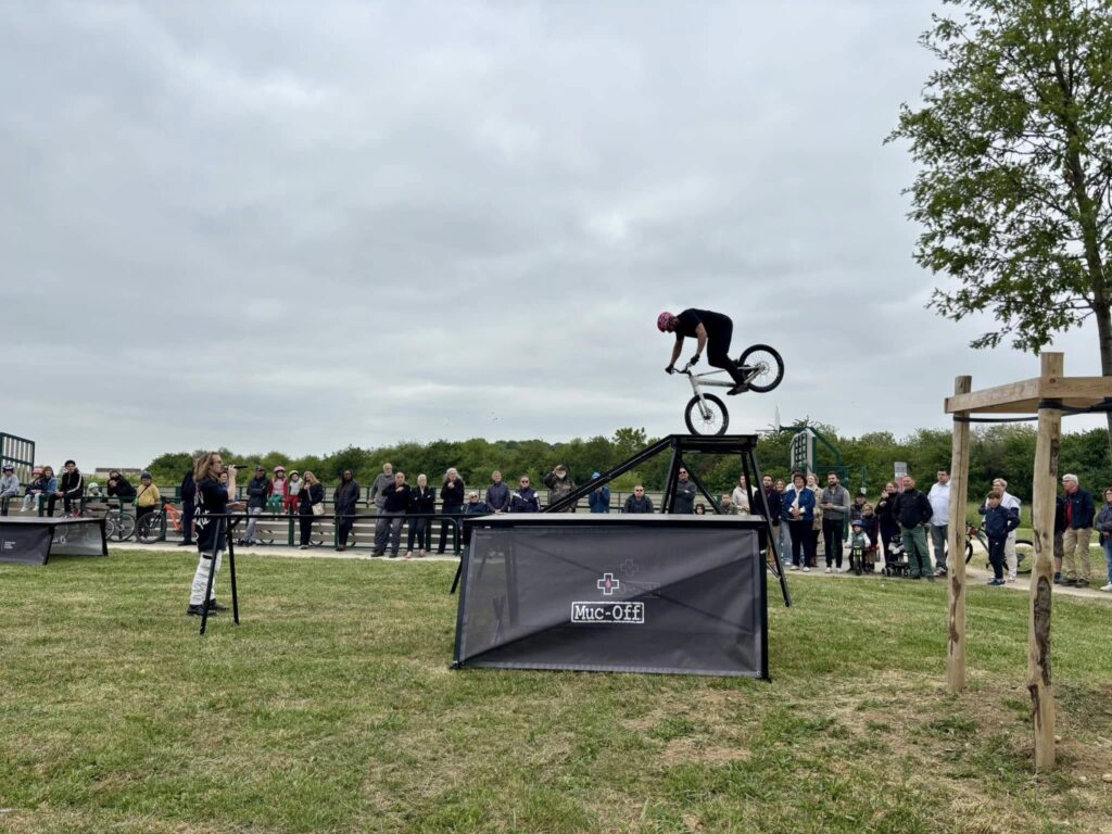 Ce matin, la petite reine était à l’honneur à Angerville, pour une inauguration spectaculaire du pumptrack aux côtés de l’équipe de X-sports shows et de Johann Mittelhausser, maire de la commune !