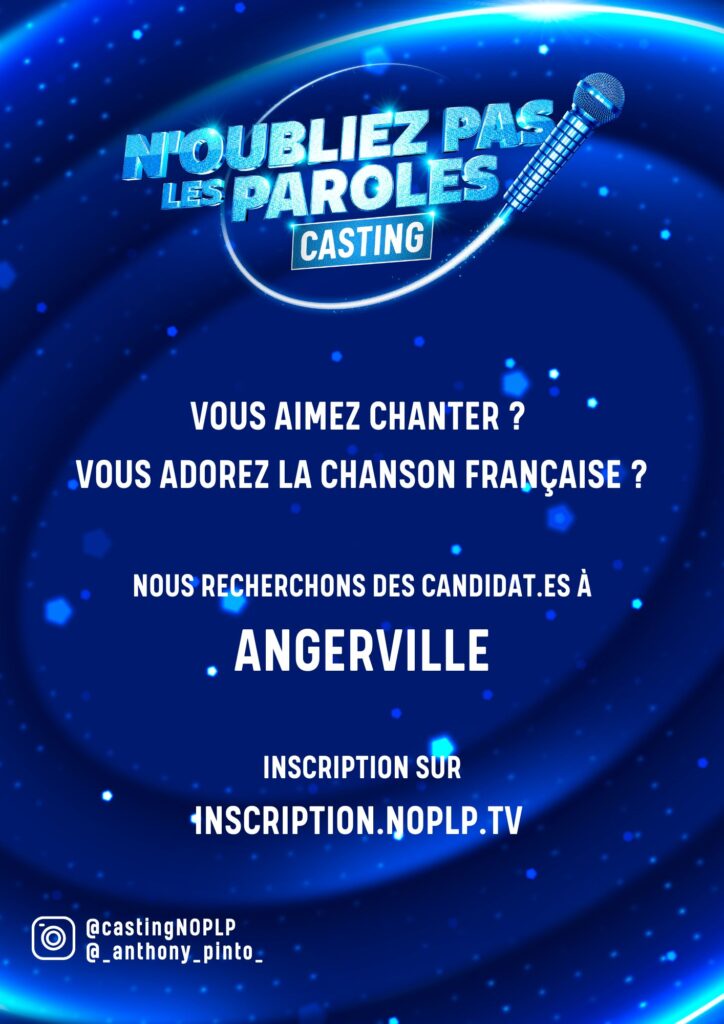 L’équipe casting de l’émission culte « N’oubliez pas les paroles ! » présentée par Nagui sur France 2 est à la recherche de candidats motivés à Angerville, prêts à tester leur mémoire sur les plus grands tubes de la chanson française et à vivre une expérience unique !