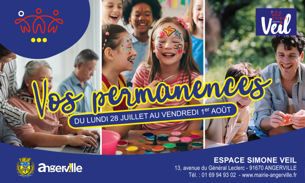 Les activités et permanences continuent à l’Espace Simone Veil en cette fin de mois de juillet… Au-delà des 2 programmes destinés aux familles et jeunes Angervillois, ponctués d’activités, d’ateliers et de sorties, que vous pouvez retrouver en intégralité à la fin de cet article, découvrez les 2 permanences qui se tiendront la semaine prochaine, les 30 et 31 juillet.