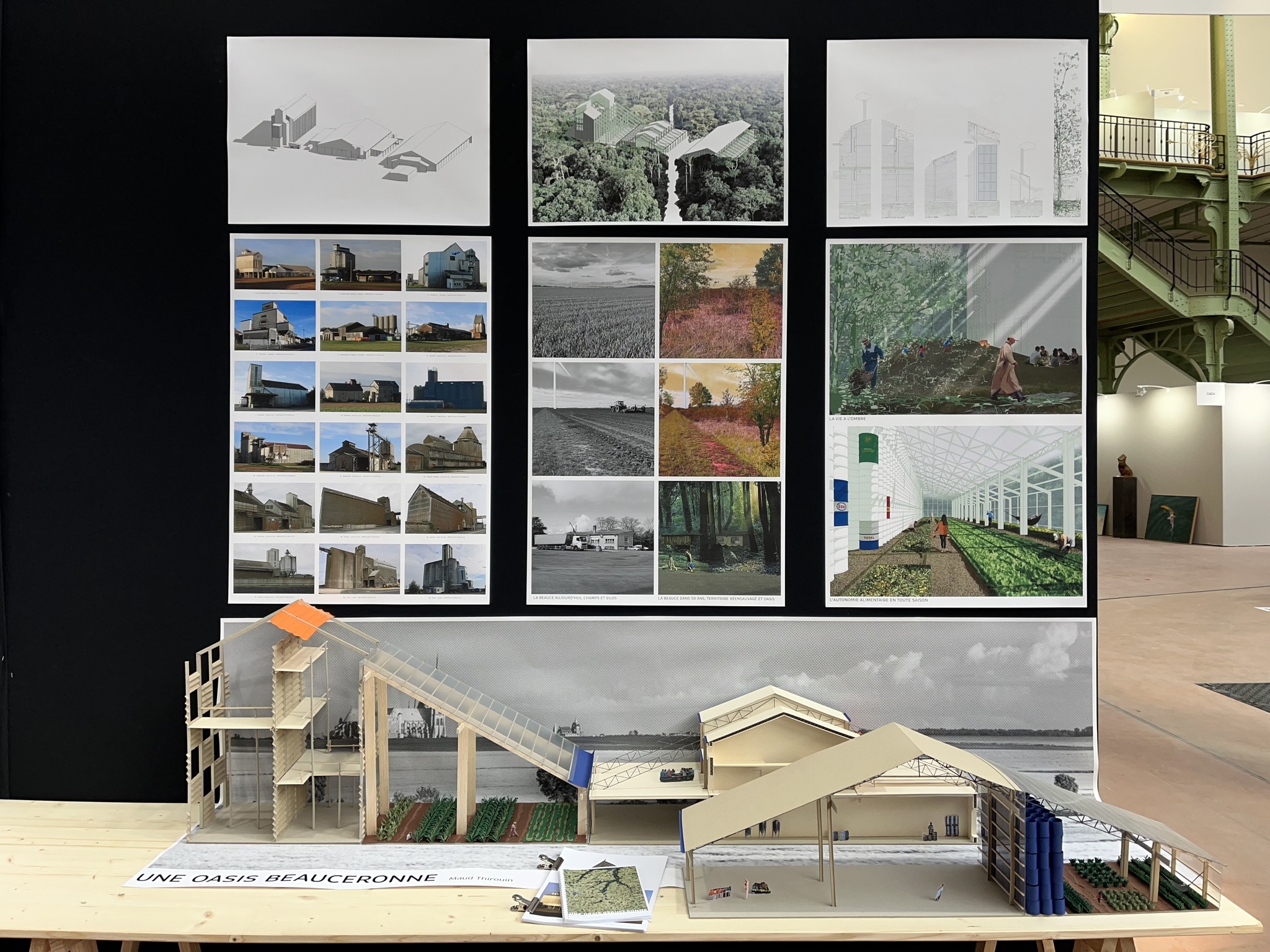 « Au moment de me pencher sur un projet, j’ai été inspiré par la démolition récente de l’ancien silo d’Angerville. J’ai projeté la réhabilitation d’un silo pour en faire un lieu de production et de commerce pour la population locale. Le silo, qui avait pour vocation de protéger les récoltes du climat extérieur, devient une oasis face au changement climatique, grâce à sa taille imposante qui génère de l’ombre et la présence naturelle de l’eau et du vent. »
