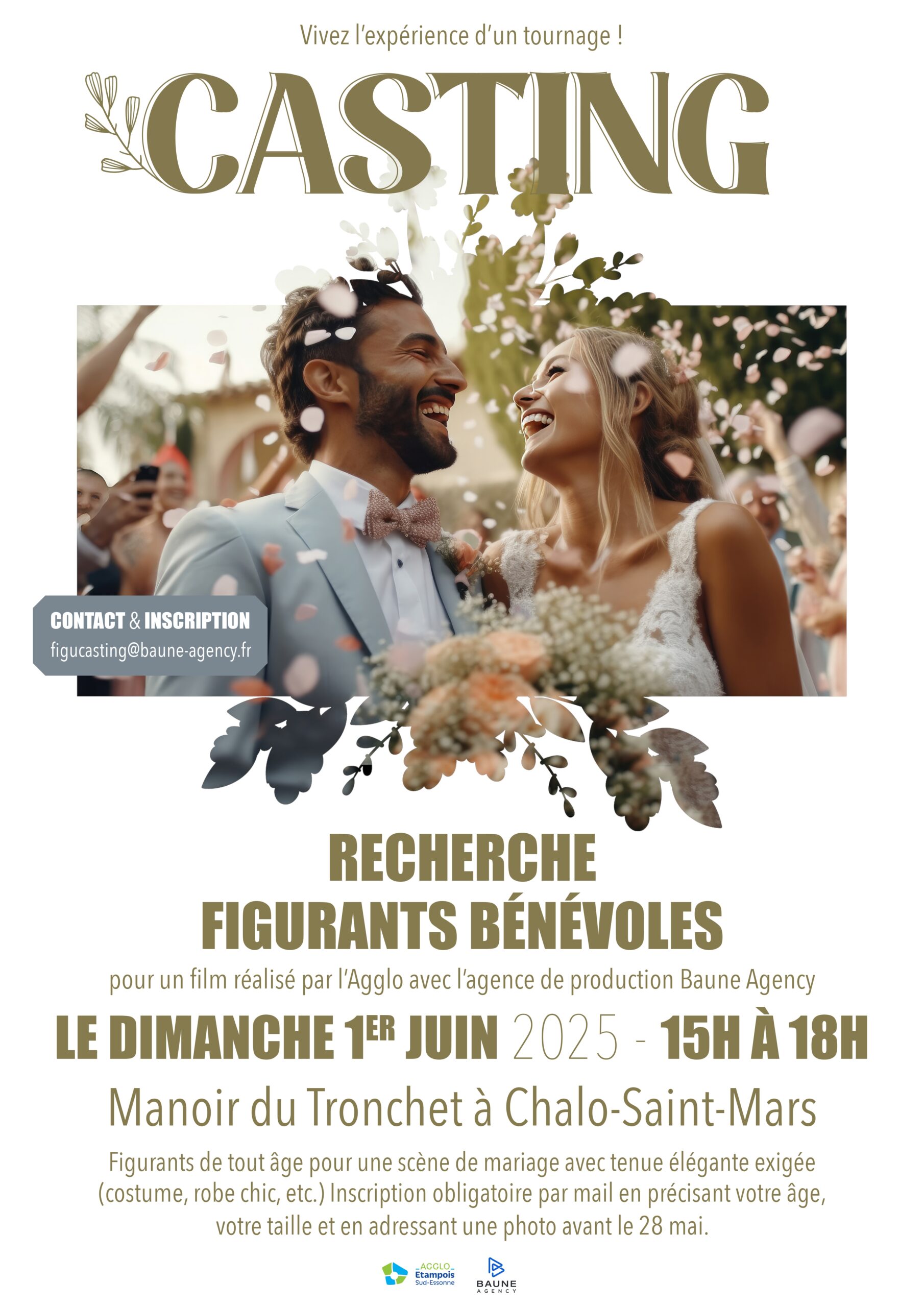 Dans le cadre de son prochain film consacré à l’attractivité médicale du territoire et réalisé dans le cadre de son plan santé, Votre agglo, accompagnée par Baune Agency, recherche UNE CENTAINE de figurants bénévoles (donc non rémunérés) le dimanche 1er juin de 15h à 18h pour une scène de mariage tournée au Manoir du Tronchet à Châlo-Saint-Mars.