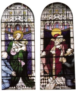 Remis à la mode au XIXème siècle, les vitraux décorent de nombreuses églises, tout en obscurcissant l’édifice. Ce vitrail a été offert par A. Prévost, un riche paroissien. Jésus, figuré en pasteur avec ses brebis, offre les clefs du « royaume des cieux » à saint Pierre.