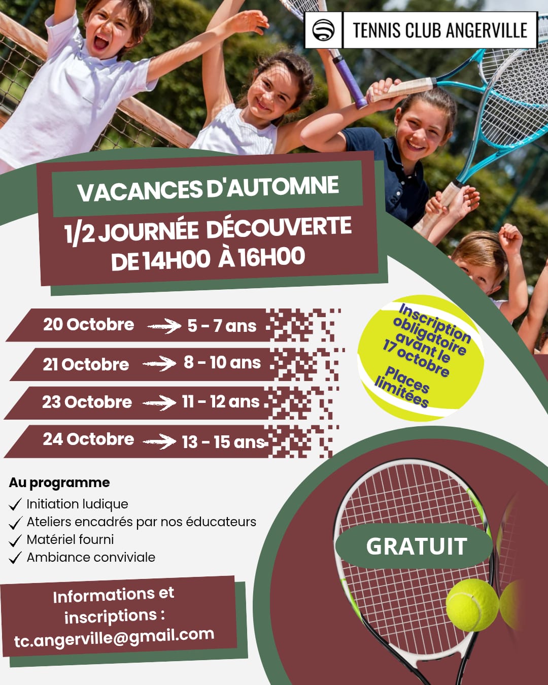 Le Tennis Club d’Angerville propose des demi-journées découvertes gratuites pour les jeunes de 5 à 15 ans, du 20 au 24 octobre, de 14h à 16h.
