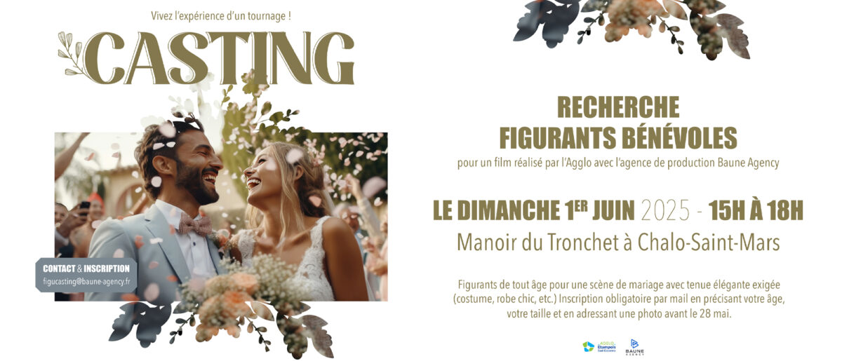 Dans le cadre de son prochain film consacré à l’attractivité médicale du territoire et réalisé dans le cadre de son plan santé, Votre agglo, accompagnée par Baune Agency, recherche UNE CENTAINE de figurants bénévoles (donc non rémunérés) le dimanche 1er juin de 15h à 18h pour une scène de mariage tournée au Manoir du Tronchet à Châlo-Saint-Mars.