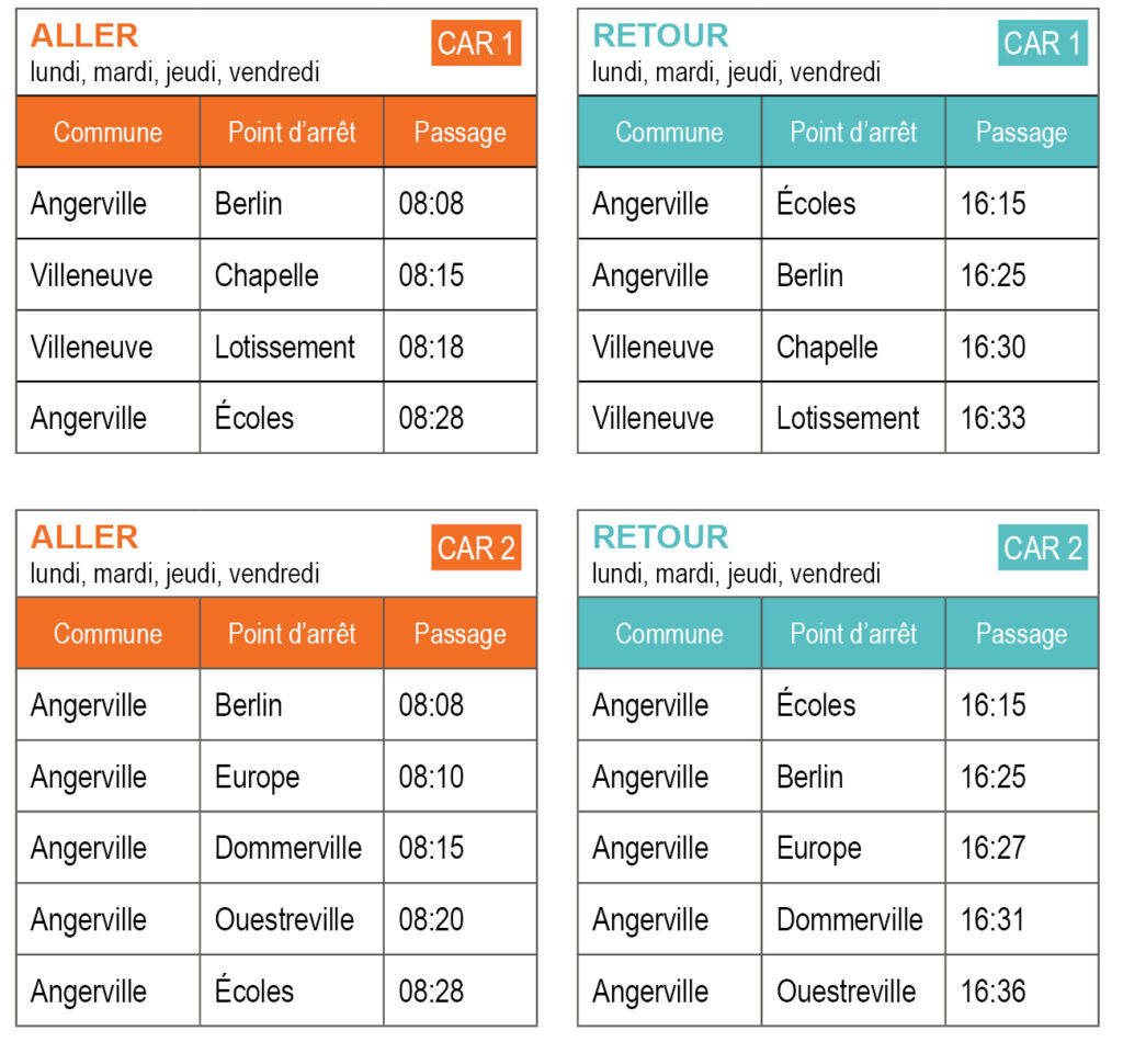 La demande de carte de transport pour le bus scolaire le Petit Nice, se fait en mairie d’Angerville. Contactez le service scolaire au 01 64 95 20 14.