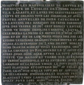 Jean de Mareau, secrétaire de la Chambre du roi, décédé le 31 août 1631, donne à la fabrique d’Angerville la maison dite « La belle image », ainsi que des terres. En contrepartie de cette donation, les marguilliers de la paroisse sont tenus d’enseigner le catéchisme et de dire et de faire dire des prières à l’intention du salut de l’âme du bienfaiteur.