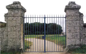 Ce portail d’entrée, donnant sur la route de Chartres, subsiste de l’ancien château, détruit par le marquis de Hallot en 1777. Les boute-roues ou chasse-roues sont destinées à empêcher les roues des voitures hippomobiles de détériorer la maçonnerie des piliers.