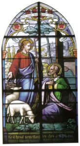 Remis à la mode au XIXème siècle, les vitraux décorent de nombreuses églises, tout en obscurcissant l’édifice. Ce vitrail a été offert par A. Prévost, un riche paroissien. Jésus, figuré en pasteur avec ses brebis, offre les clefs du « royaume des cieux » à saint Pierre.